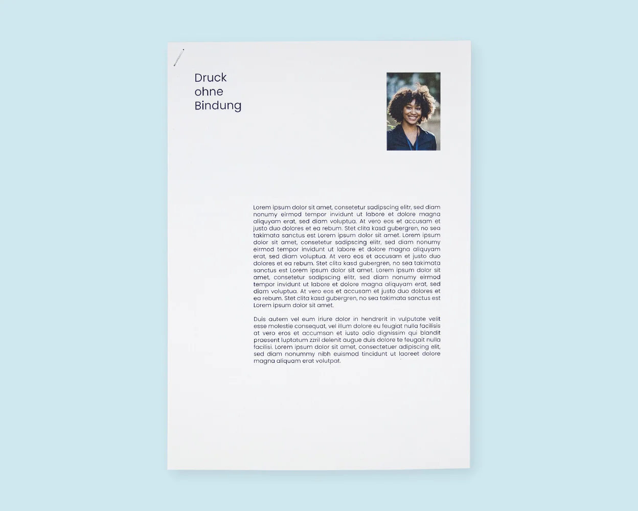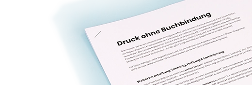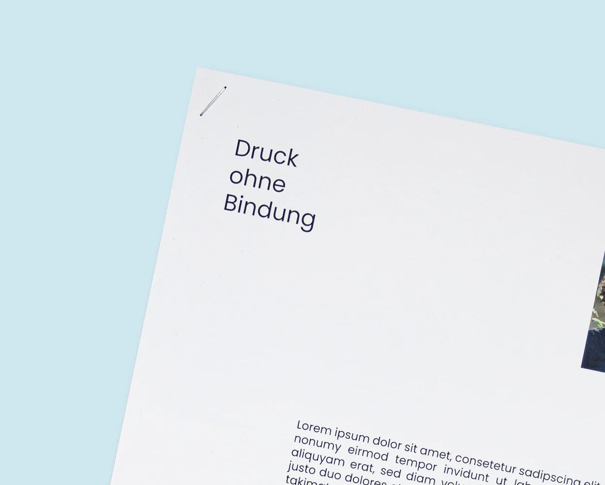 The corner stapling method is a simple and efficient solution to bind up to 100 sheets (double-sided printing possible) mechanically. This binding is ideal for smaller quantities where a quick and inexpensive finish is desired. Corner stapling keeps your documents securely and neatly together – perfect for brochures, catalogs, or manuals.