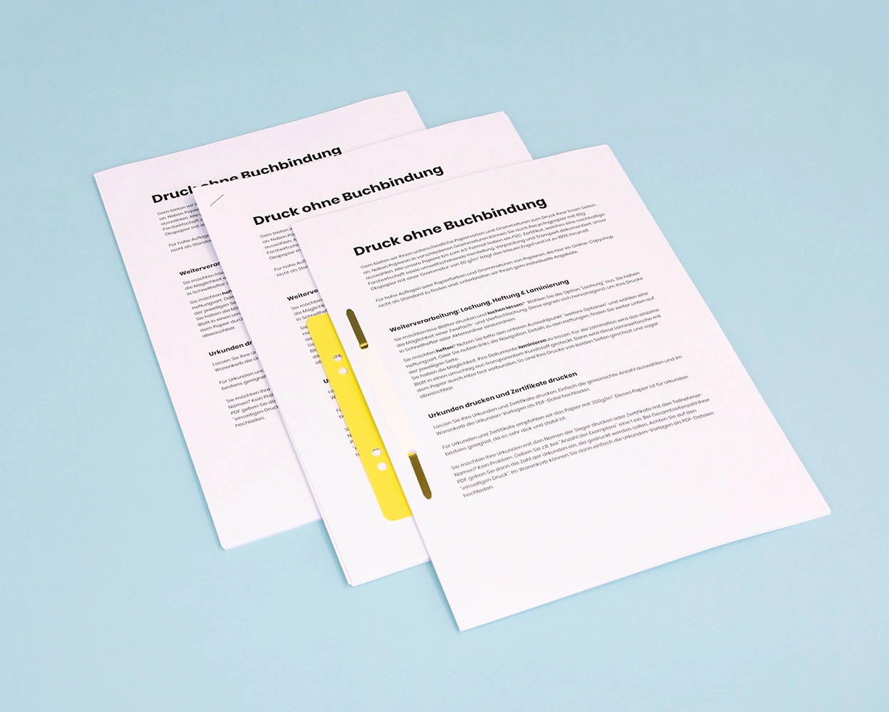 Our online copyshop prints your PDF files razor-sharp. You can choose from various paper types and finishes. In addition to bound print products, we also offer loose pages without punching or binding.
