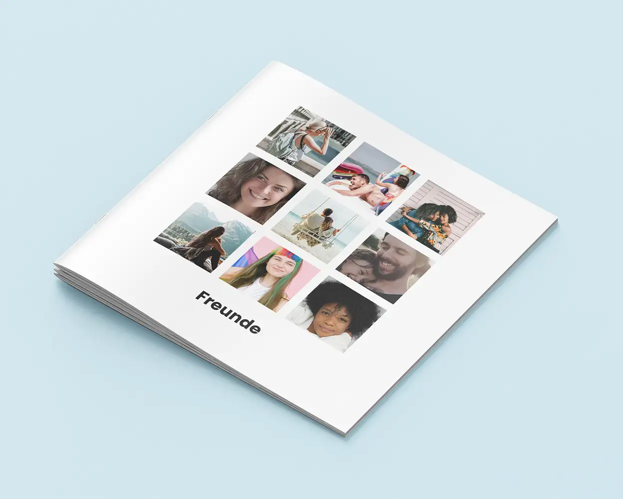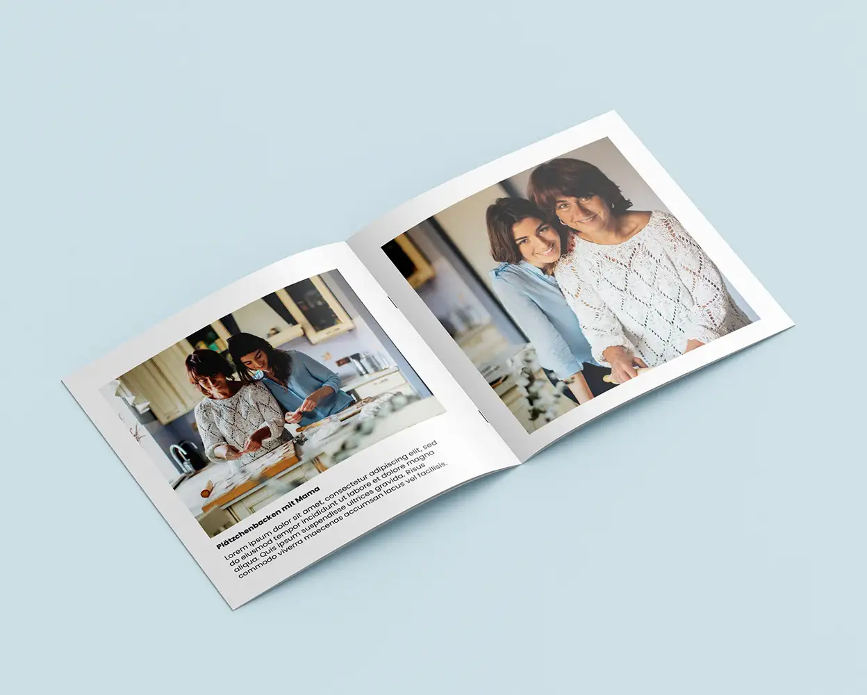 The stitched photo booklet – also known as a photo booklet or booklet – is the most affordable and compact way to present your pictures in high print quality. The saddle stitch binding allows the pages to open flat, making double-page spreads stand out perfectly.