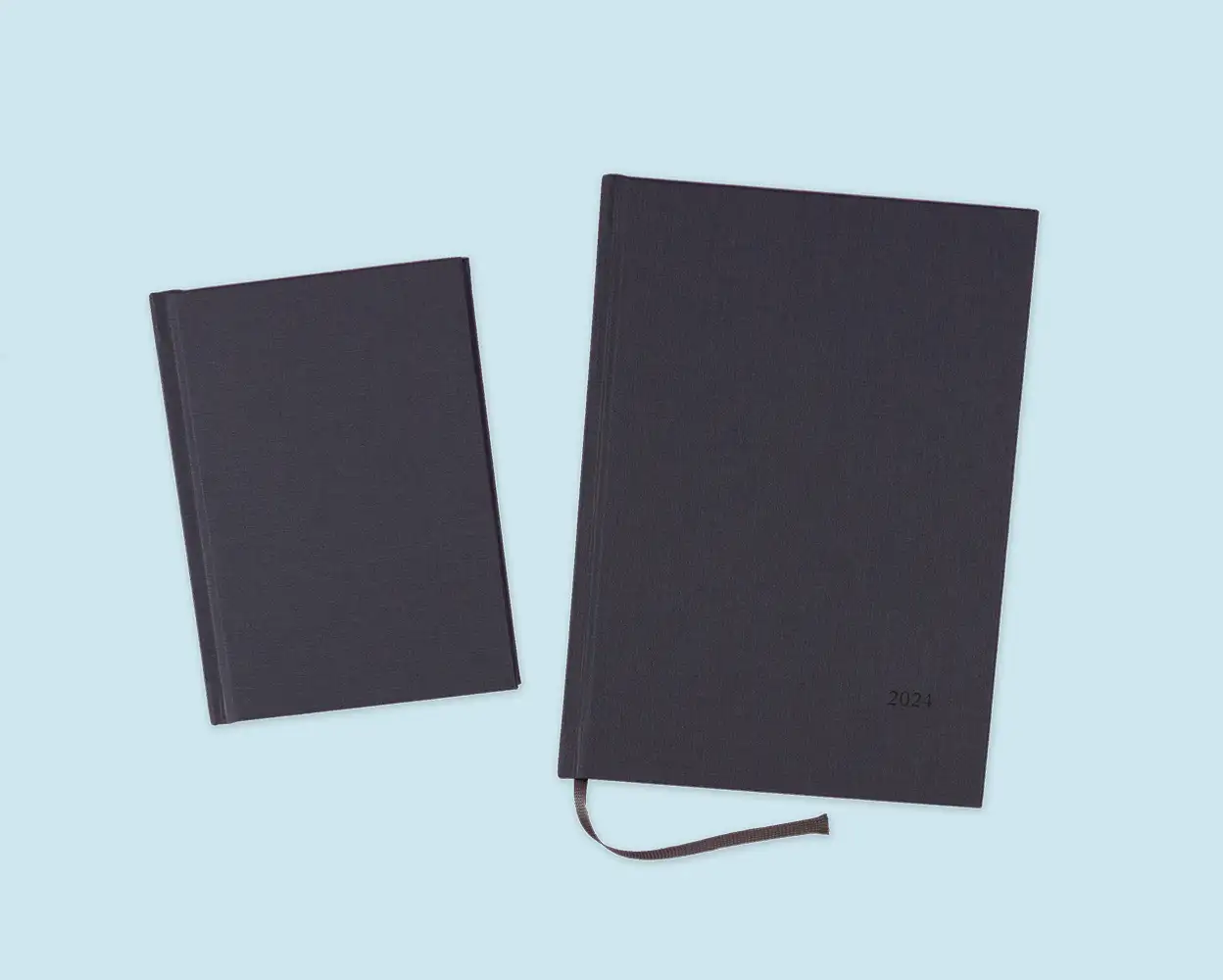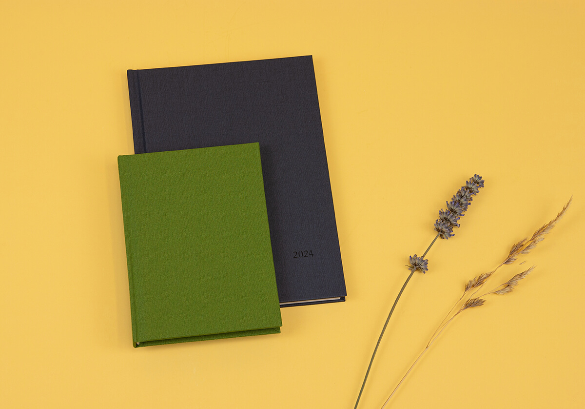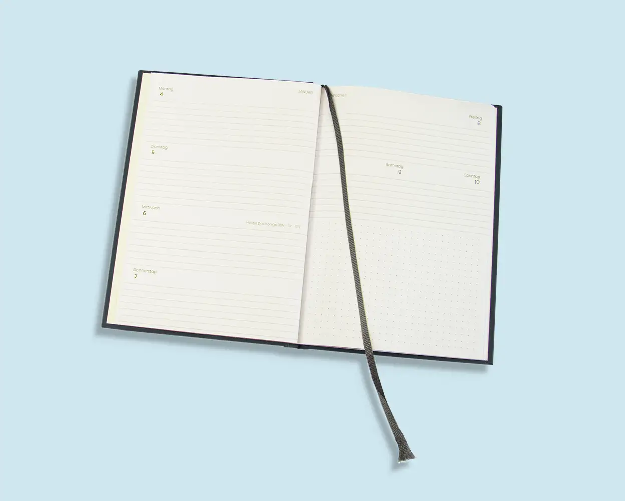 Suchen Sie einen funktionalen und eleganten Wochenplaner für das gesamte Jahr? Unser Wochenplaner bietet Ihnen durch seinen stabilen, vernähten Buchblock eine lange Lebensdauer und ausgezeichnetes Aufschlagverhalten. Der Hardcover-Einband in edlem anthrazitfarbenem Buchleder oder grünem Leinen, veredelt mit einer edlen Prägung, schützt nicht nur zuverlässig, sondern überzeugt auch durch ein zeitloses und ansprechendes Design.